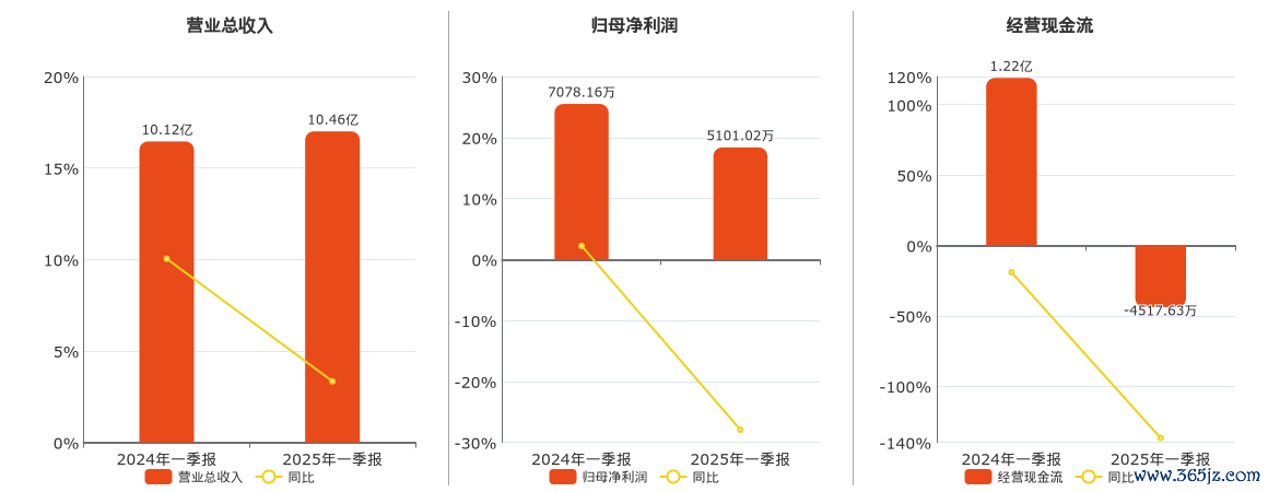公司营业总收入为10.46亿元,在已披露的同业公司中排名第9,较去年同报告期营业总收入增加3377.10万元,实现5年连续上涨,同比较去年同期上涨3.34%。归母净利润为5101.02万元,在已披露的同业公司中排名第11,较去年同报告期归母净利润减少1977.14万元,同比较去年同期下降27.93%。经营活动现金净流入为-4517.63万元,在已披露的同业公司中排名第23,较去年同报告期经营活动现金净流入减少1.68亿元,同比较去年同期下降136.88%。